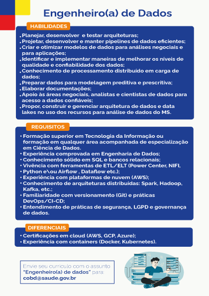 Currículos devem ser enviados para o e-mail: cobd@saude.gov.br, com o assunto “Engenheiro(a) de Dados”.